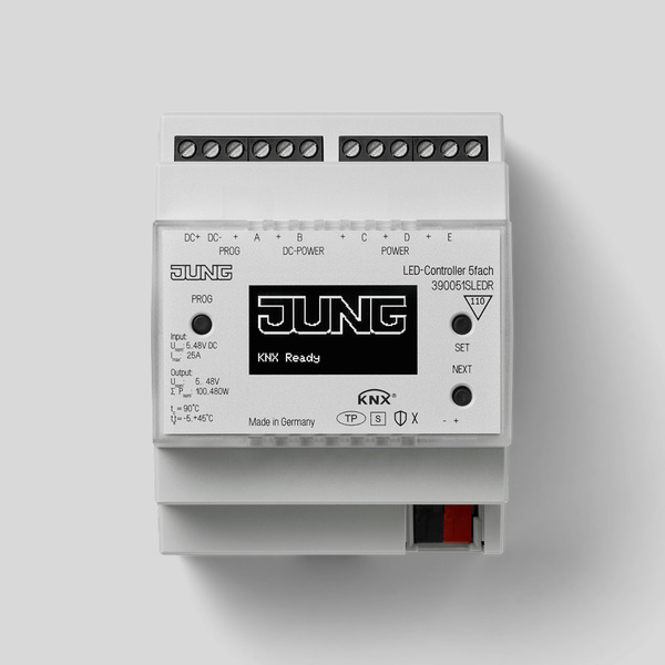 LED-Spots, LED-Stripes, RGB(W), Tunable-White- oder RGB+CCT-Leuchten: Die JUNG KNX LED-Controller eignen sich ideal für die Steuerung von Niedervolt-LED ohne Steuertrafo mittels Pulsweitenmodulation (PWM). Sie sind sowohl für die Montage auf der Hutschiene als auch für die Installation als Einbaugerät verfügbar. Die Controller sind ideal für die Ambientebeleuchtung im Heimbereich geeignet. Doch auch kleine Geschäfte, Restaurants oder Hotels profitieren von den KNX LED-Controllern 5-fach.